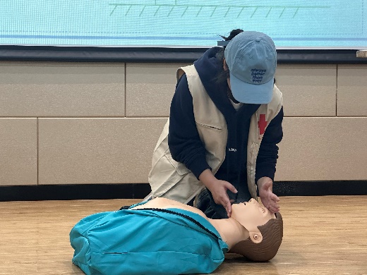 杨波老师围绕“压哪里?哪里压?怎么压?”三个问题,携手应急救护志愿服务队的成员示范了CPR的动作并强调注意事项,用生动有趣的方式逐步指导大家学习胸外按压的技能技巧,随后进行现场知识点测试,同学们积极回答问题,获得老师的高度赞扬。