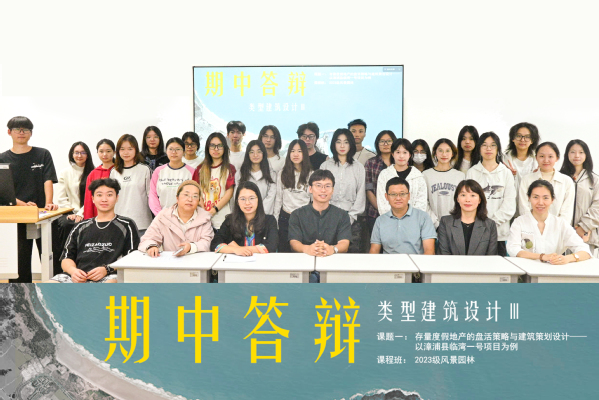 2025年11月7日上午,建筑学院2023级风景园林专业《类型建筑设计Ⅲ》和《社会综合调查研究》课程期中答辩在主5#320教室举行。本次答辩由课程教师张浩,何俊花共同主持,围绕“存量海滨度假地产的盘活策略与策划设计”,以漳州市漳浦县一个真实项目为实践课题,呈现了一场跨学科、校企深度融合的“真题实做”教学实践。