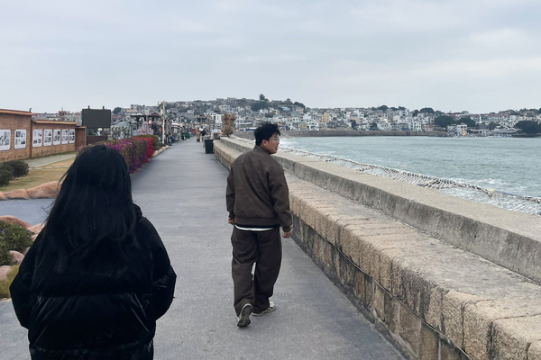 调研首站,师生们顶着寒风沿南门海堤行走,观察旅游开发下传统老街的适应性。主街上,民宿与咖啡馆吸纳着当地元素,呈现出一派繁荣景象。