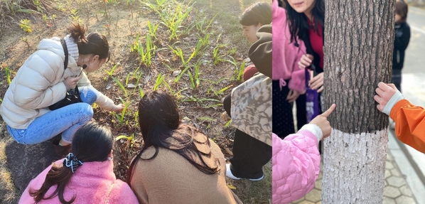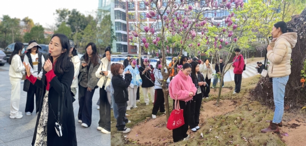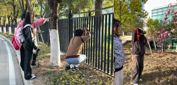 下午16:30,师生们在经管楼与理工楼间的玉兰广场集合,带着放大镜、便携显微镜、望远镜、记录本等观察工具,沿着预设路线漫步校园。活动以寻春迹实践探索为核心,引导学生们启动视觉、嗅觉、触觉等多重感官,全方位感知春天的生命律动。