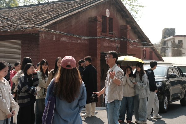 图3 带队老师张浩向同学们介绍漳州茶厂建筑功能 摄影:冯德涵